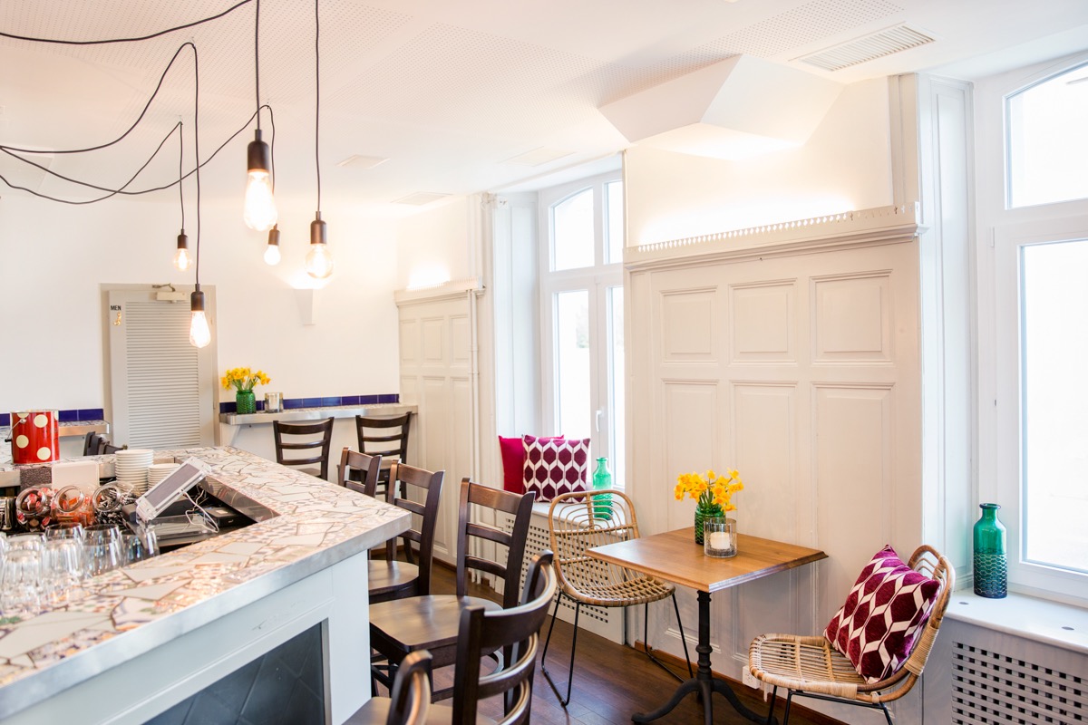 Das Lokal wirkte trist und etwas vernachlässigt. Die Besitzer, ein junges dynamisches Paar, wollten daraus eine freche, gemütliche Weinbar machen. Mit verschiedenen Sofas, Hockern und mehreren Tischen kreierten wir ein Zuhausegefühl. Die Accessoires sollten ebenfalls denen eines Wohnzimmers entsprechen. In der ersten Phase musste das Lokal jedoch erst einmal «aufgepeppt» werden. Maler, Schreiner, Sanitär und Elektriker leisteten grossartige Arbeit und gaben dem Lokal seinen ursprünglichen Glanz zurück! Bei den Möbeln entschieden wir uns für die folgenden Materialien: Leder, Metall, viel Holz mit einem roten Farbakzent. Die Lampen aus schwarzem Rattan über den Tischen und die coole Lampe von Seletti über der Bar bilden einen Hingucker und wirken gleichzeitig sehr dekorativ. Die Kissen aus verschiedenen Materialen, hängende, unterschiedliche Pflanzenkörbe, Vasen und viele Glasbehälter mit Kerzen runden das wohnliche Raumgefühl ab. Nun können die Gäste die hervorragenden Weine in gemütlicher Atmosphäre geniessen!