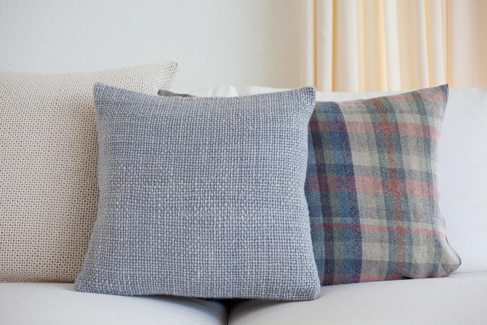 Die vom Kunden definierte Aufgabe; eine reine und neutrale Atmosphäre schaffen, die es einem erlaubt von der spektakulären Sicht zu profitieren! Nur das Notwendigste sollte erworben werden; schöne und qualitativ hochwertige Möbel in den Tönen ecru, weiß und beige würden in die Wohnung passen. Die Stimmung und die Einrichtung sollten wirklich sehr neutral und schlicht bleiben. Wir suchten edle Stücke aus; wie das ecru Sofa von Verzelloni, das weiße Schramm Bett, die übergroßen Teppiche, der eine Vintage, der andere von Vanghent aus Naturfasern. Wir kombinierten diese eleganten Möbel mit Altholz Möbeln, wie die beiden Seitentische am Bett oder die große Konsole im Eingang und dazu die Vintage Stühle von Eames mit den grauen Harzschalen um den modernen ovalen Tisch von Punt. Dieser Mix vermeidet, dass das ganze Ensemble von hellen und strukturierten Möbeln zu langweilig oder zu klassisch wirkt! Wir ergänzten das Ganze mit schönen leichten Lampen aus Stoff von Hind Rabii, Hocker und Kissen von Avec und Leinenvorhängen, in den Farben Vanille für den Wohnbereich und Kaki für den Schlafbereich. Um eine farbenfrohe, fast Ferienstimmung zu erzeugen, wählten wir Türkise Bettwäsche von Society. Sie erinnert an die Blaue Farbe des Sees, und gibt dem Kunden, die erwartete Ausgeglichenheit.